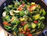 Faites revenir les blanc de poireaux avec les courgettes et les champignons dans une poêle à feu vif de manière à les faire dorer tous les légumes, ils doivent rester ferme.
